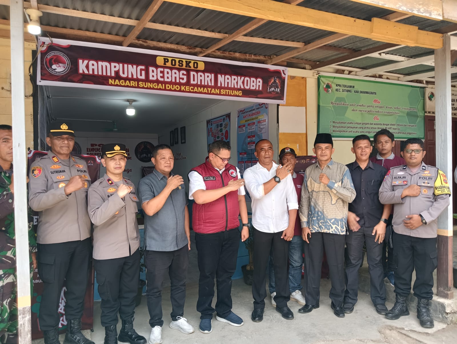 Dharmasraya,Sumbartoday.co.id-Direktur Reserse Narkoba Polda Sumatera Barat, Kombes Pol Wedy Mahadi, S.I.K., M.AP., meninjau Posko Kampung Bebas Narkoba di Kenagarian Sungai Duo yang di gelar di kantor Nagari Sungai Duo, Kecamatan Sitiung, Kabupaten Dharmasraya, kamis (13/11/25).